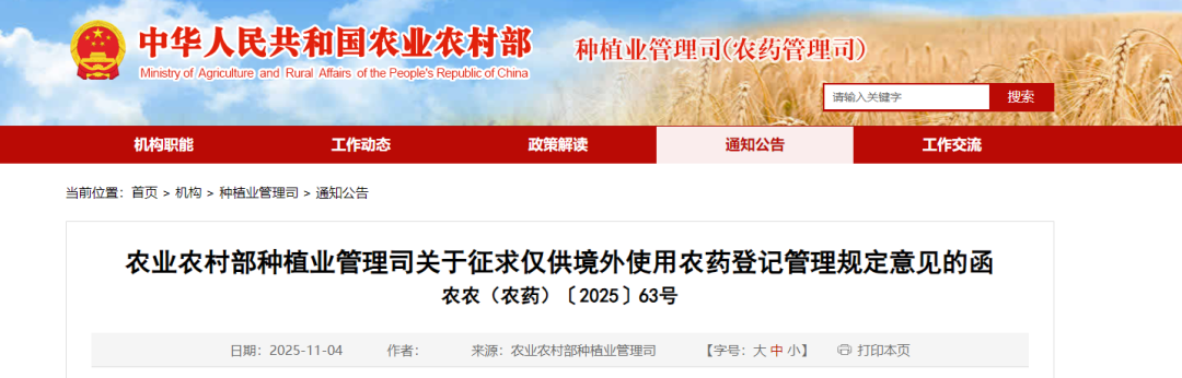2025年11月3日 ,为进一步规范农药出口管理,根据《农药管理条例》、《农药登记管理办法》有关要求,农业农村部种植业管理司发布关于征求仅供境外使用农药登记管理规定意见的函。